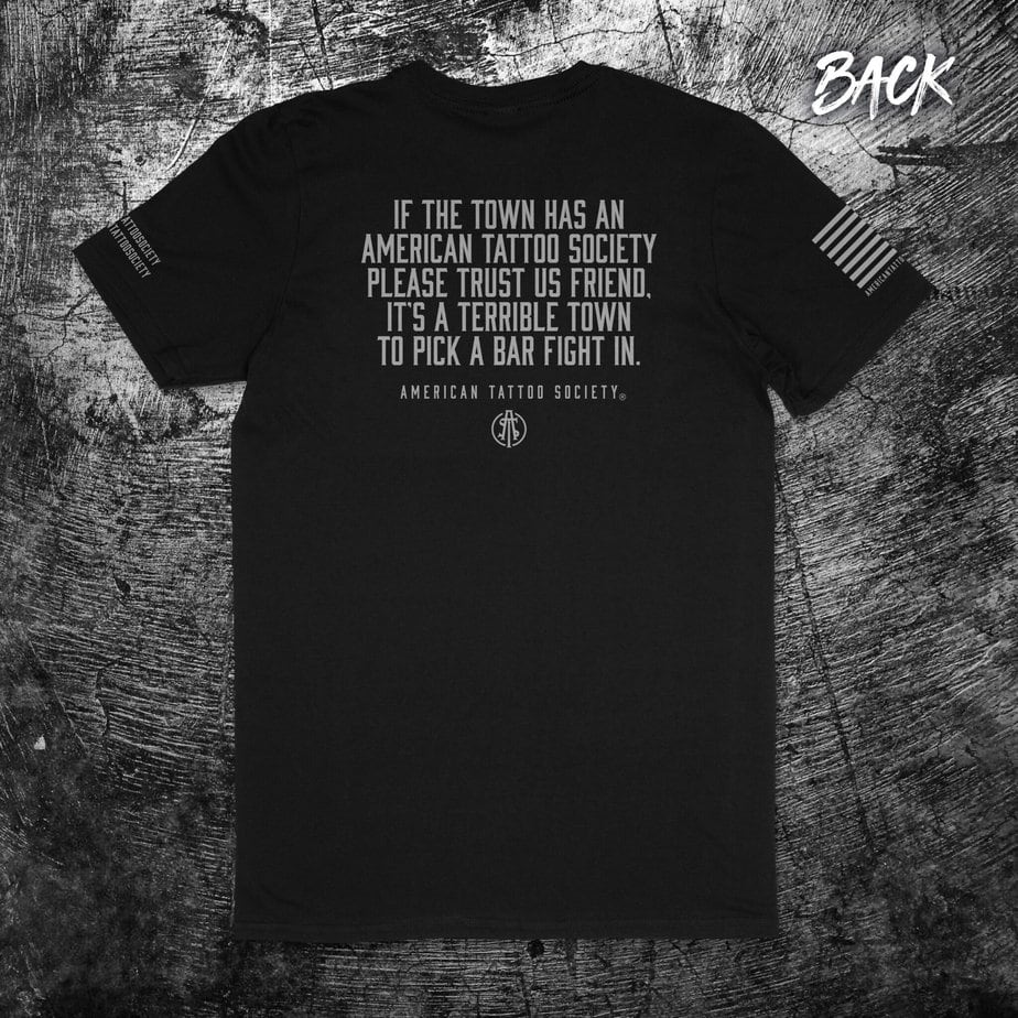 An ATS Original “Bar Fight” Silver graphics on a black shirt.